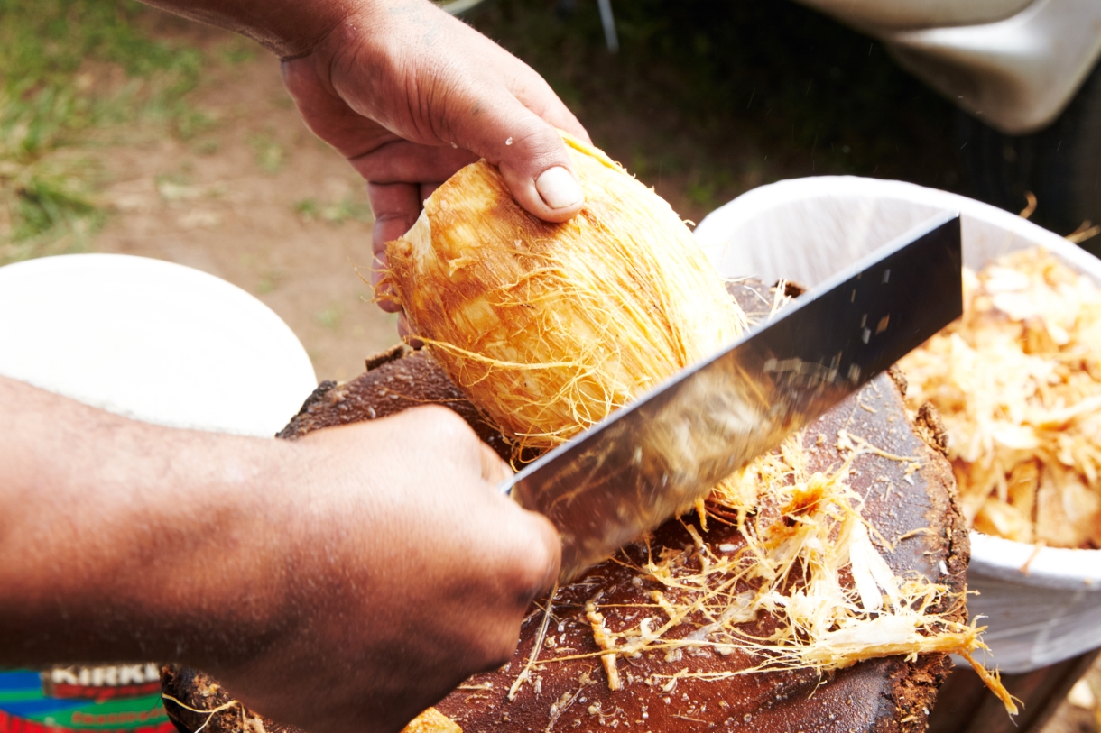 <ナタで豪快にココナッツを削ります>