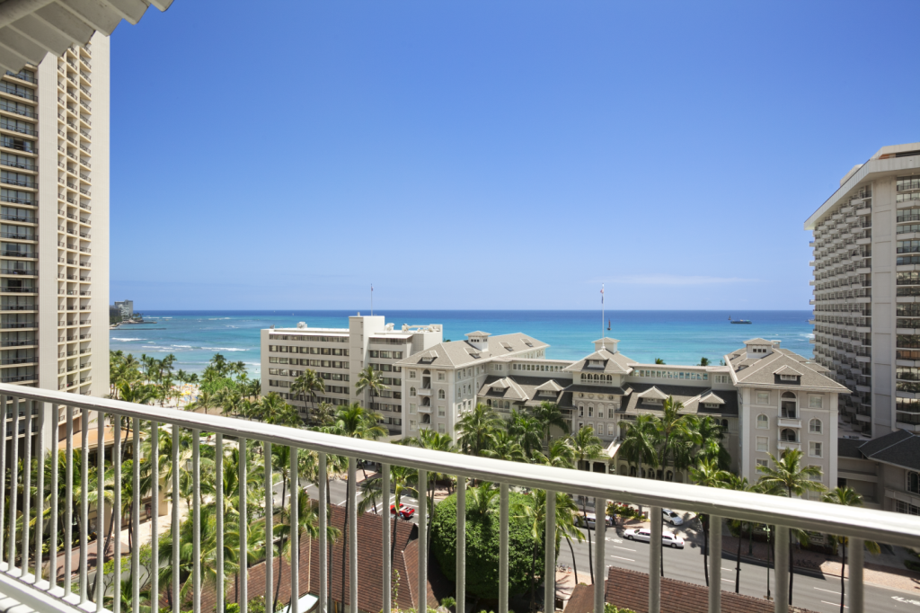 こちらはゆったりとしたフロアプランのお部屋。広いプライベート・ラナイ(バルコニー)があり、ここから望むことができるのはワイキキビーチとその街並み。さらに、プールサイドで催されるエンターテインメントも楽しむことができます。