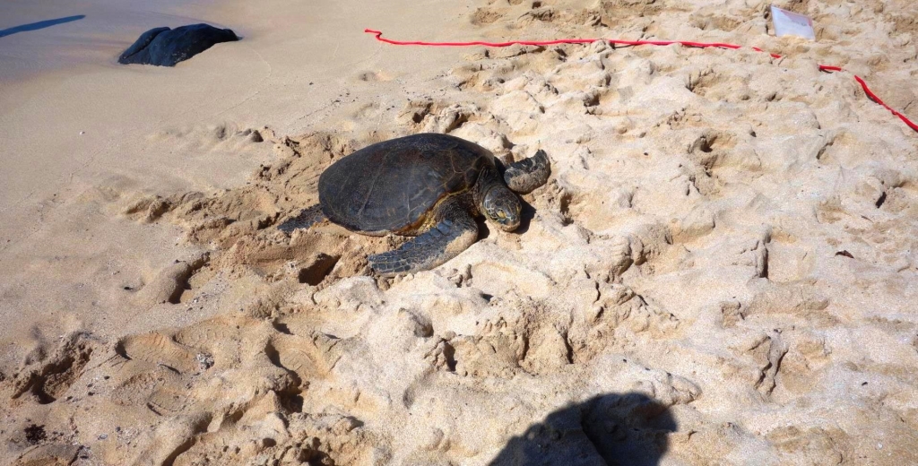 ウミガメが上陸するのは、主に岩場があるエリア。その日のタイミングによって出会えるかどうかは運次第。ですが、ウミガメがやってきたときは周辺を監視するスタッフが、赤いロープで囲いをつくり、人間が近づきすぎないように制限されます。