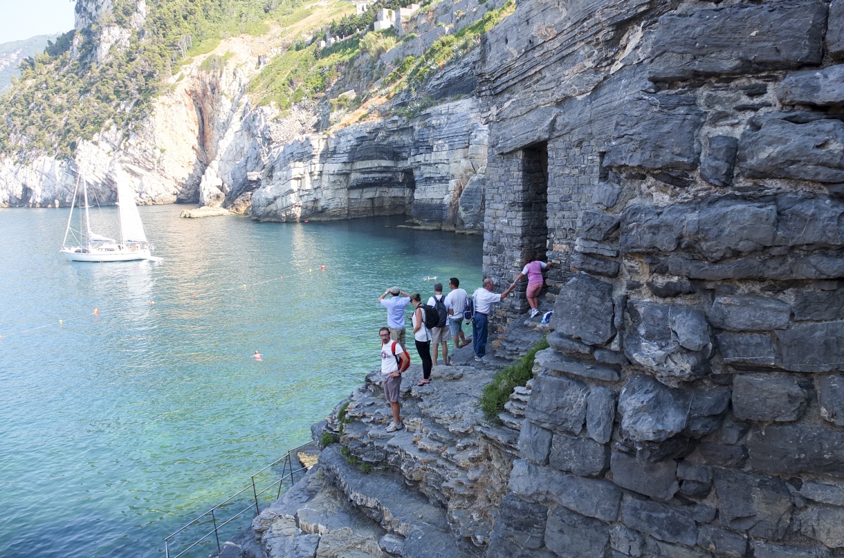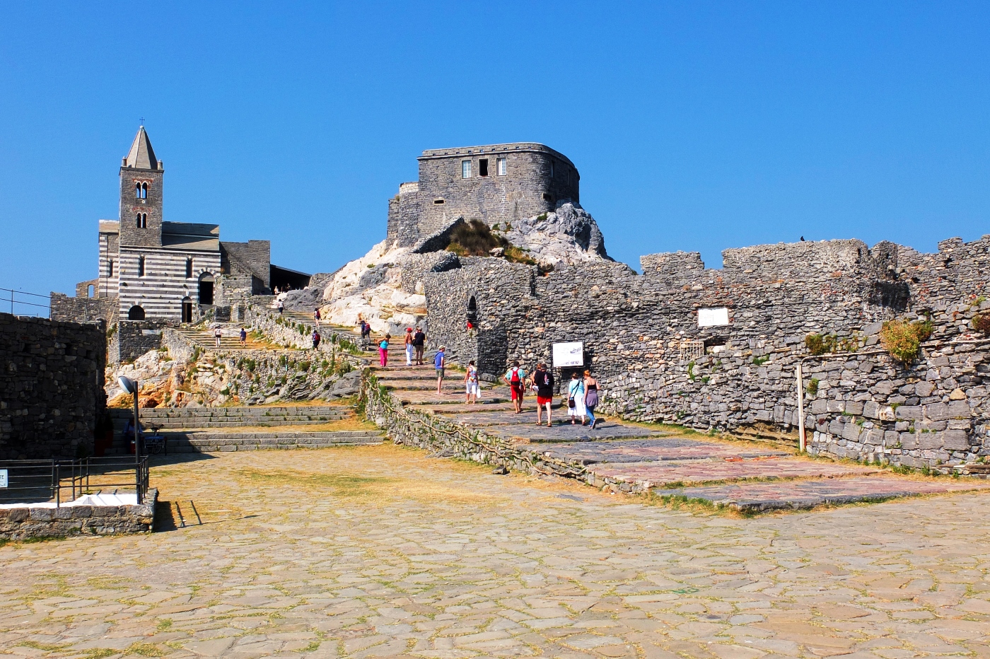 まるで要塞のような石造りの建物は、「サン・ピエトロ教会」と呼ばれる、ポルトヴェーネレの観光名所。教会周辺は「詩人達の入り江」と呼ばれています。