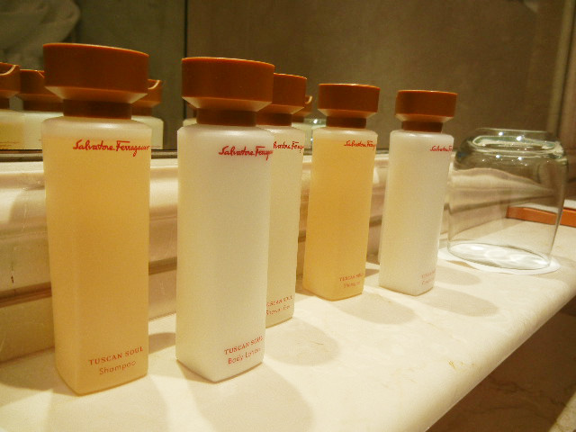 ホテルのお楽しみと言えばアメニティ。こちらも全てフェラガモの製品です。ファラガモの香水「TUSCAN SOUL」という上品な香りで統一されていますが(ホテル滞在当時)、この香りは全てイタリア産の材料で作られていて、爽やかで洗練された森林と花の香りは、男女問わずお気に召すこと間違いなし。