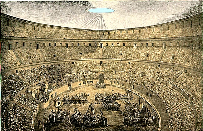 コロッセオで繰り広げられるものの中で人々が最も熱狂した見世物、それはなんと「模擬海戦」でした。文字通り、このアリーナ部分に海を見立てて水を張り実際に船を浮かべて海戦を再現してしまったのです。