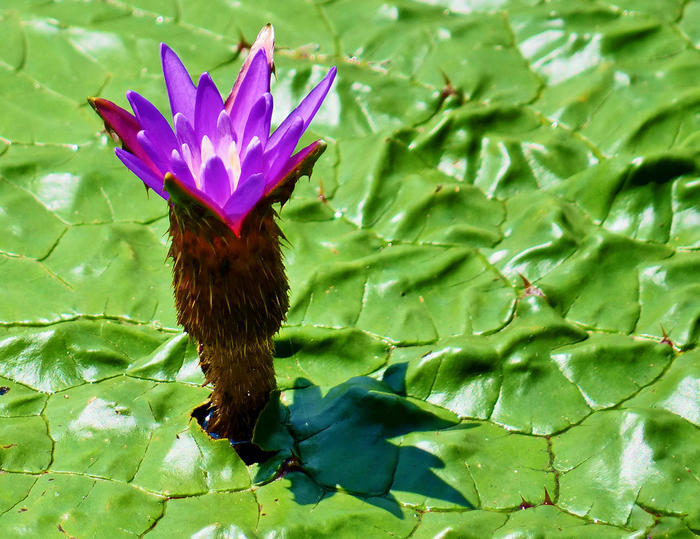 池を一面に埋め尽くすことで光合成を遮り、他の種が生えない戦略をとる植物。その葉を突き破って成長する花の姿は恐ろしげではありますが、都内で自生している場所はここだけですので、ぜひ見ていただきたいです。