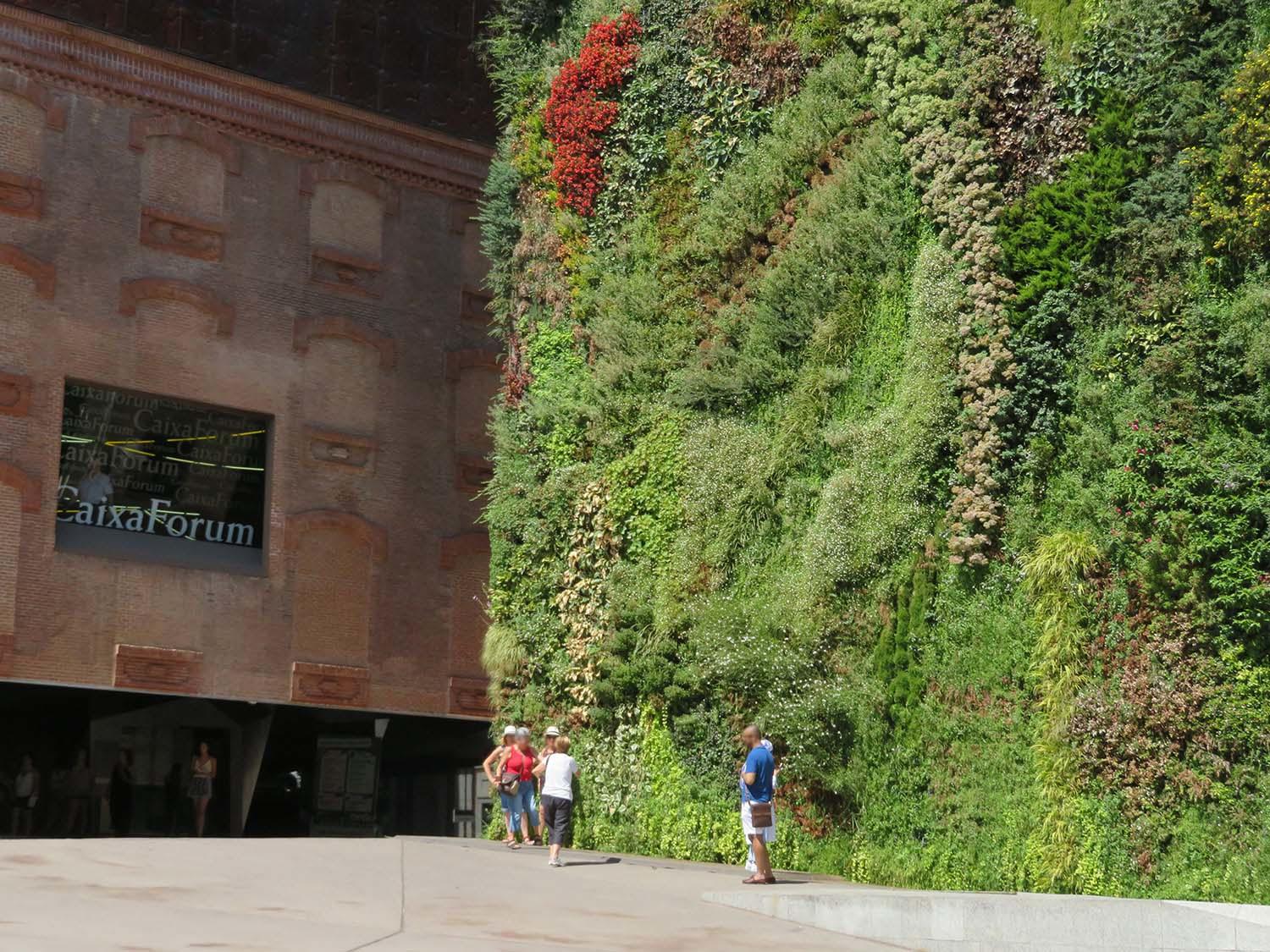 昔ガソリンスタンドだった所を広場にし、奥にカタルーニャ州の銀行が文化センター及び展示会場を造り、広場の横の高さ24メートル、460平方メートルの壁を250種、15,000の植草で埋めました。2007年パトリック・ブラック(Patrick Blac)のデザインです。金属製の支え、何層もの特性格子網、プラスチックシートなどを使用し、管で定期的に水を補給するようにしてあります。