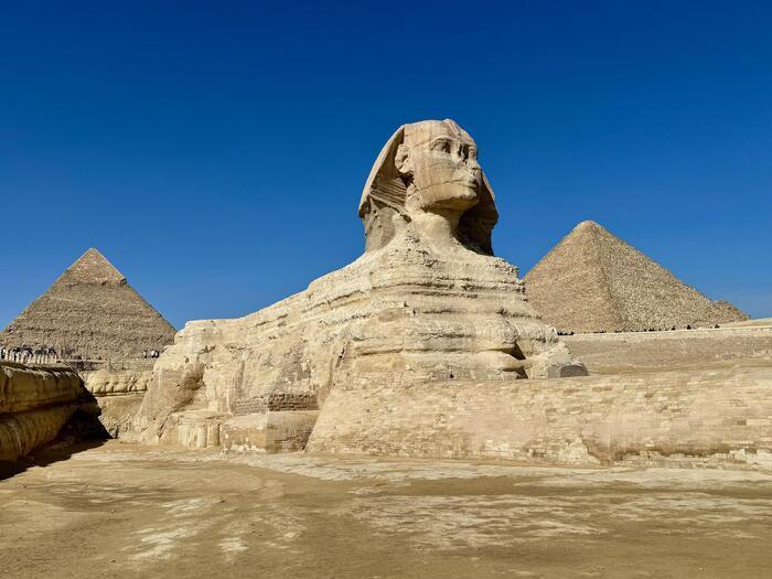 スフィンクスは後方に見えるカフラー王のピラミッドと同時に建造されたと言われていますが、真相はまだ分かっていません。