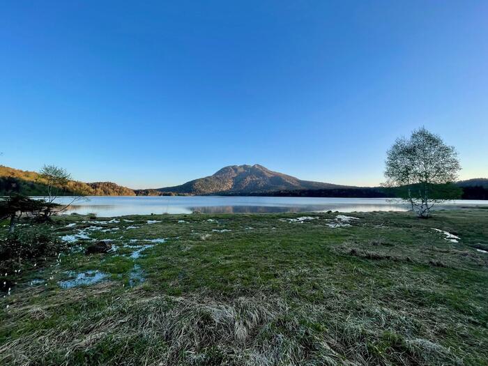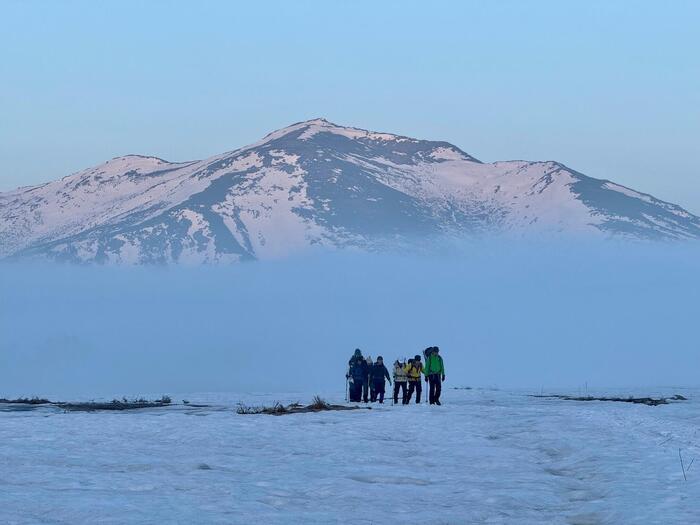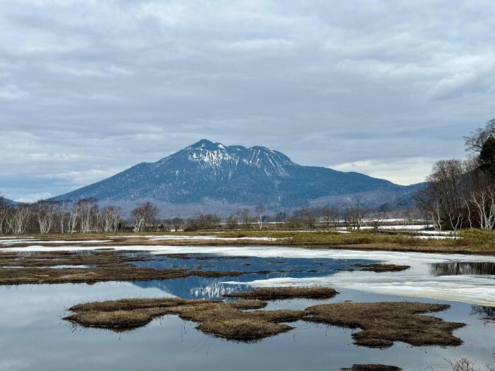 ゴールデンウィークの尾瀬は年によって違いますが、まだまだ雪の中。しかし、尾瀬ヶ原では雪解け水が満杯に溜まり、天気が良ければ水鏡を見ているようです。オープンしている山小屋が少ないので、静寂の尾瀬を体験することができます。