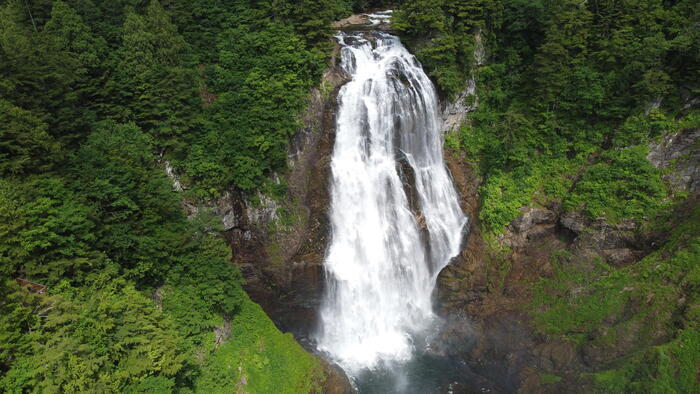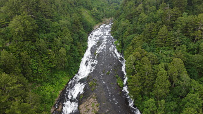 三条ノ滝です。上空からだと滝の上部から滝つぼまで見ることができます。