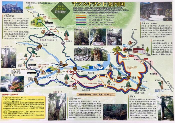- 屋久島自然休養林では、森林の自然な状態をできるだけ保持するよう整備しておりますので、滑落、転倒、枯れ枝の落下などの危険があります。頭上や足下には十分注意して散策してください。