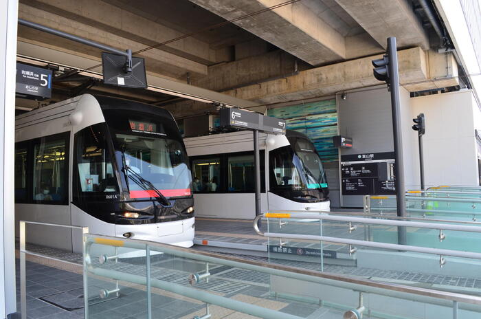 富山市内は路面電車を使っての移動がとても便利。富山駅の南側を走る路面電車には、中心市街地を回る環状線の他、富山大学や富山地方鉄道南富山駅を結ぶルートがあり、市民や観光客の足として活躍しています。