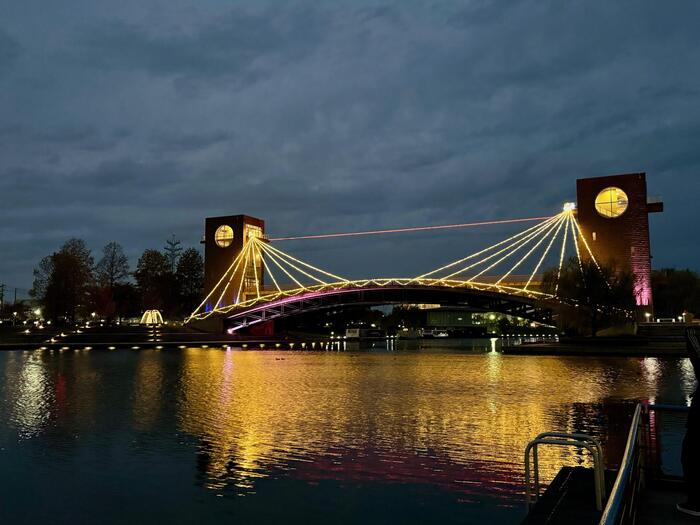 運河の船だまりを利用して造った親水公園。展望台を備えた天門橋や芝生広場、遊歩道などが整備されています。