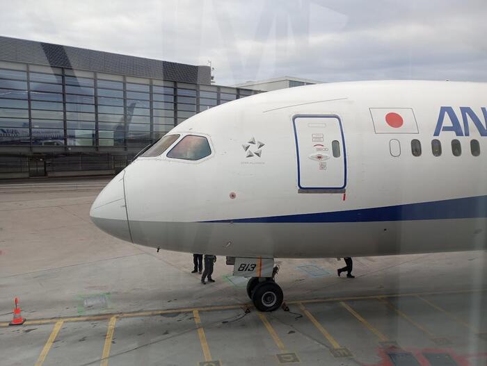 出国審査を終えて搭乗ゲートに向かう途中に見えてきました、日の丸付きのANAの機体。搭乗ゲートに辿り着いただけでもう既にホーム感漂います。いよいよ日本へ向けて出発!