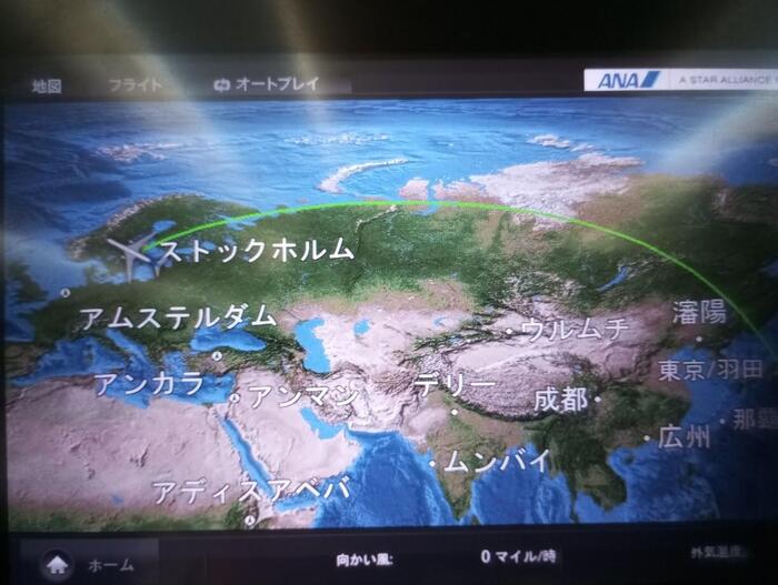 モニターではロシア上空を通る飛行ルートが表示され焦りましたが、実際には中東上空を飛行する迂回ルートでした。ロシア上空をまた飛べるようになったらスウェーデン⇔日本間がもっともっと近くなるはず!!それにしてもアンマンってお腹が空いてくる文字ですが...。ついつい珍地名探しをしてしまう私です(笑)。