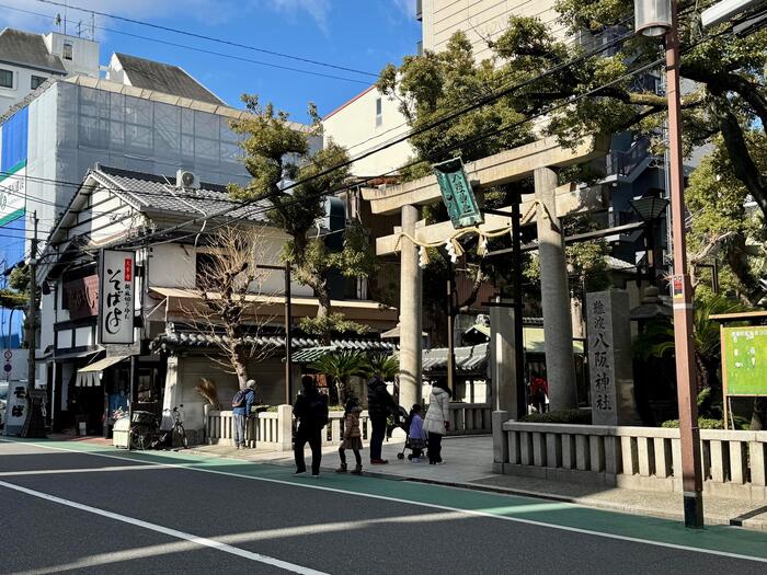 南側の正面鳥居です。難波八坂神社の隣には胡麻切りそばの有名店「そばよし元町本店」があります。