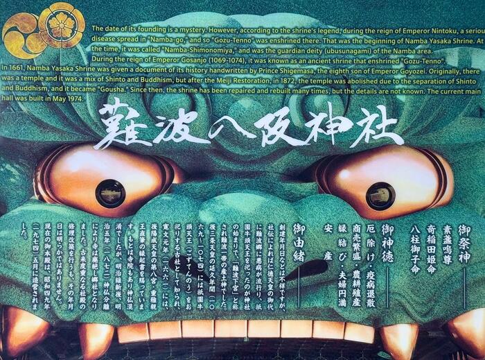 当社(難波八阪神社)の創建年月日など詳しい資料は残っていませんが、社伝によれば古来「難波下の宮」と称し難波一帯の産土神でした。後三条天皇の延久(1069年から1073年)の頃から祇園牛頭天王(ごずてんのう)をお祀りする古社として世間に知られていました。もとは神仏混淆でしたが、維新後、神仏分離により寺は廃民衆の困苦を除かれた故事に基づき始められたと言われています。「摂津名所図絵」や「摂津名所図会大成」にも紹介されています。また、絶し、明治5年(1872年)に郷社となりました。現在のご本殿は、昭和49年(1974年)5月に完成。毎年1月の第3日曜日に行われている綱引神事は当社の御祭神、素盞嗚尊(すさのをのみこと)が八岐大蛇(やまたのおろち)を退治し、平成13年(2001年)には、大阪市で初めての無形民俗文化財に指定されました。<難波八坂神社の公式HPより引用>
