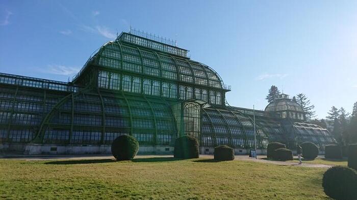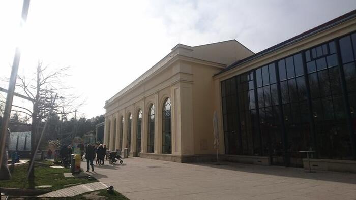この入り口は動物園に入る前から見どころたっぷりです。門に向かって左側に見える巨大なガラスの建物は、皇帝フランツ・ヨーゼフの時代に建てられた、当時世界最大の「温室」。
