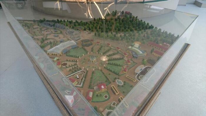 <動物園の模型全体図。パビリオンを中心に放射線状に広がっているのがメインエリア、左が平地エリア、奥の丘になっているところが森エリア。入り口は手前と左端と山の上の3か所にある>
