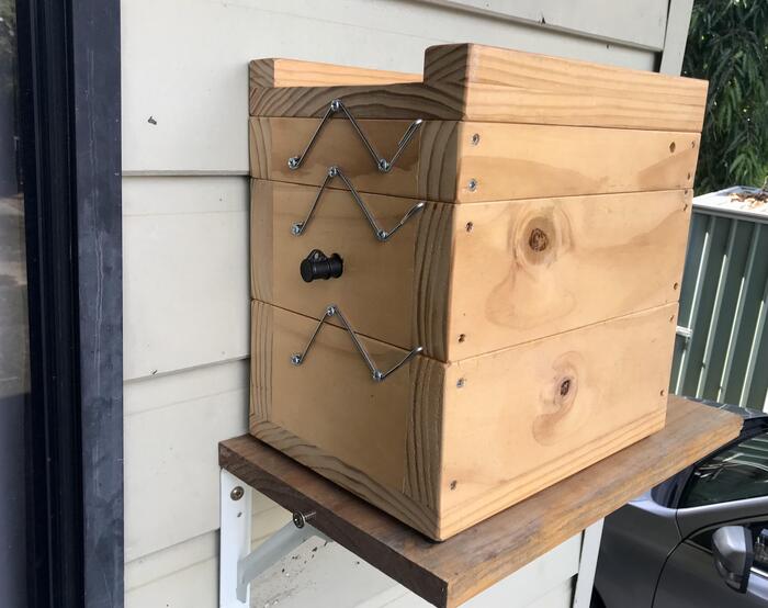 まず重要なのは、巣箱を置く場所。ネイティブビーは寒さが苦手なので、冬はしっかり日が当たる場所が理想です。でも、ケアンズの夏はかなり暑くなるので、直射日光がガンガン当たると巣箱の中が高温になりすぎてしまうんです。