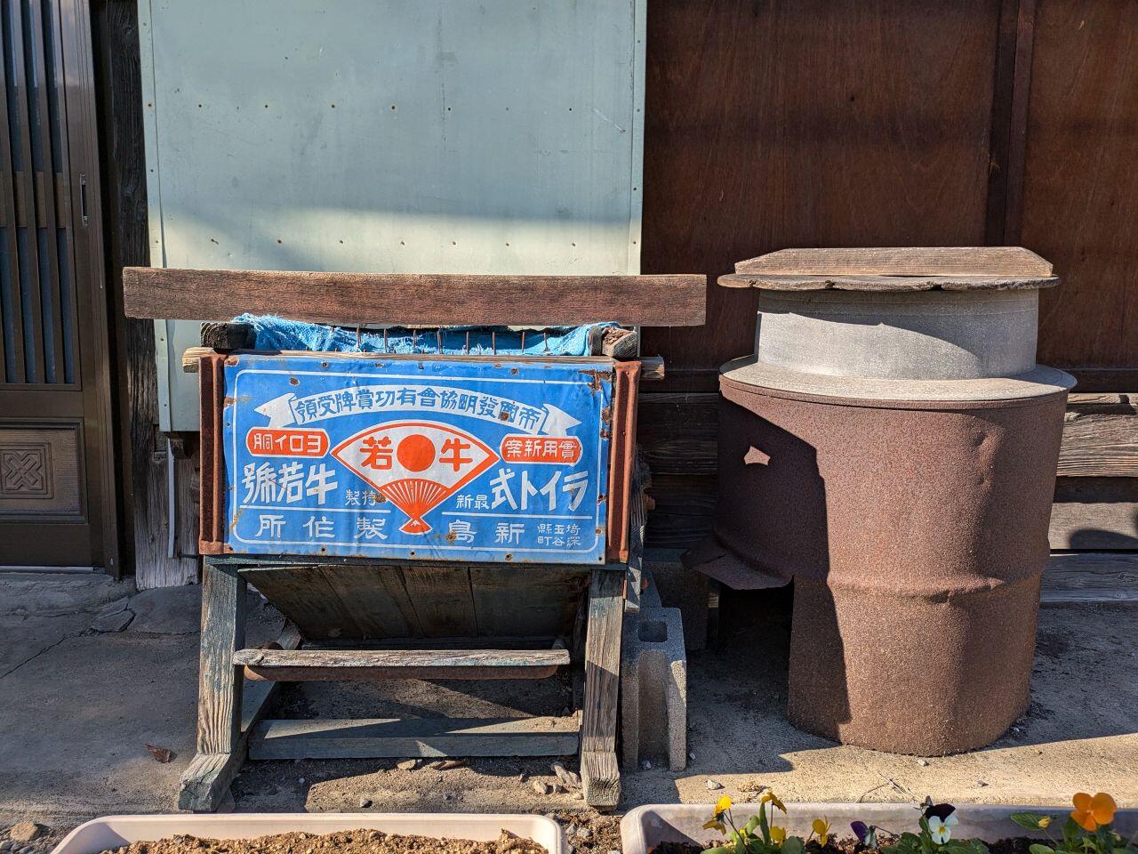 右側のドラム缶に乗っているのは大きな釜だと分かりますが、左側のものは一体何?しかも、文字が右から書いてある?