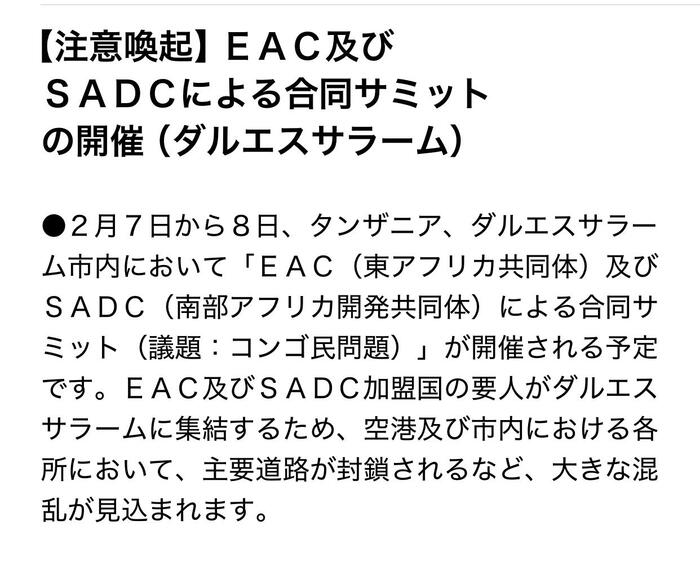 <2025年2月5日付の在タンザニア日本大使館からのメッセージ>