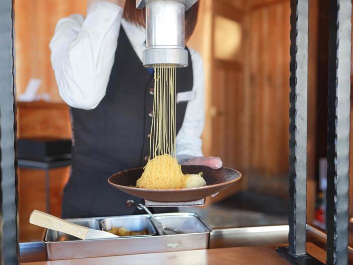 目の前でモンブランを絞ってくださるライブ感に、旅の高揚感も重なり、特別な思い出に。優しい黄色の手絞りモンブランは、なんとも愛おしいビジュアルです。