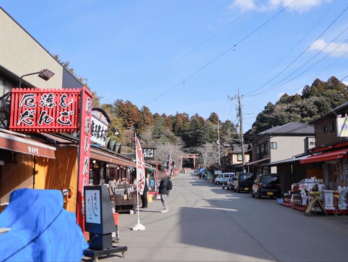 赤い鳥居をくぐると、たくさんの灯篭が並ぶ表参道が続いています。このエリアには桜や楓が植えられていて、春には桜花、秋には見事な紅葉が見られるスポットでもあります。