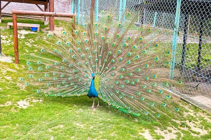 春は恋の季節。オスのクジャクが羽を広げてメスにアピールしていました。飾り羽を入れたオスの体長は180〜250cm。羽を広げた姿は美しいですが、それ以外ではとても邪魔そう。イケメンを気取るのも大変です。