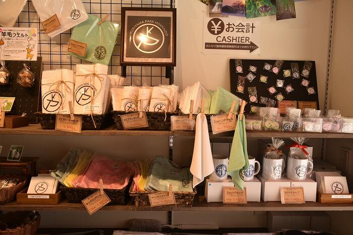 なかよし動物園内の「Kuriyama Park Shop」では、トートバッグやマグカップなど、オリジナルグッズを販売しています。Kuriyama Parkの頭文字「KP」とシカの角を組み合わせたロゴマークはさりげなくオシャレ。普段使いに最高です。