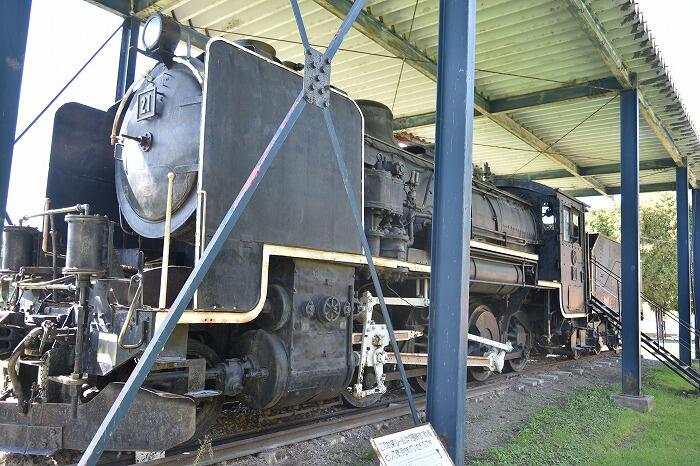 公園内には「1D加熱テンダー機関車第21号」という蒸気機関車が展示されています。太平洋戦争が始まった翌年の1941(昭和16)年に製造され、函館本線・野幌駅から栗山駅を経由して夕張本町駅まで運行していた夕張鉄道(1975年廃止)で使用されていました。まさに塊という迫力。石炭を燃料にしているため運転室は暑く、扱いも難しかったそうです。