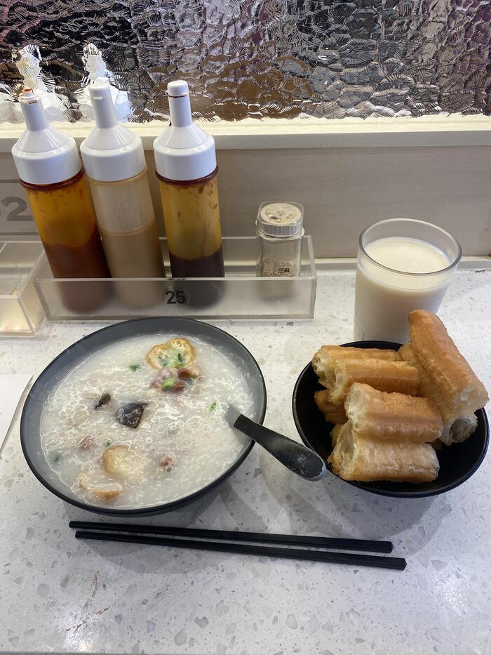 皮蛋痩肉粥は広東粥の一種で、香港や台湾で朝食の定番となっています。写真にもある油条という揚げパンはお粥に浸して食べるとよく合います。お粥ですが油が使われているので腹持ちがよく、朝ご飯にぴったりです。