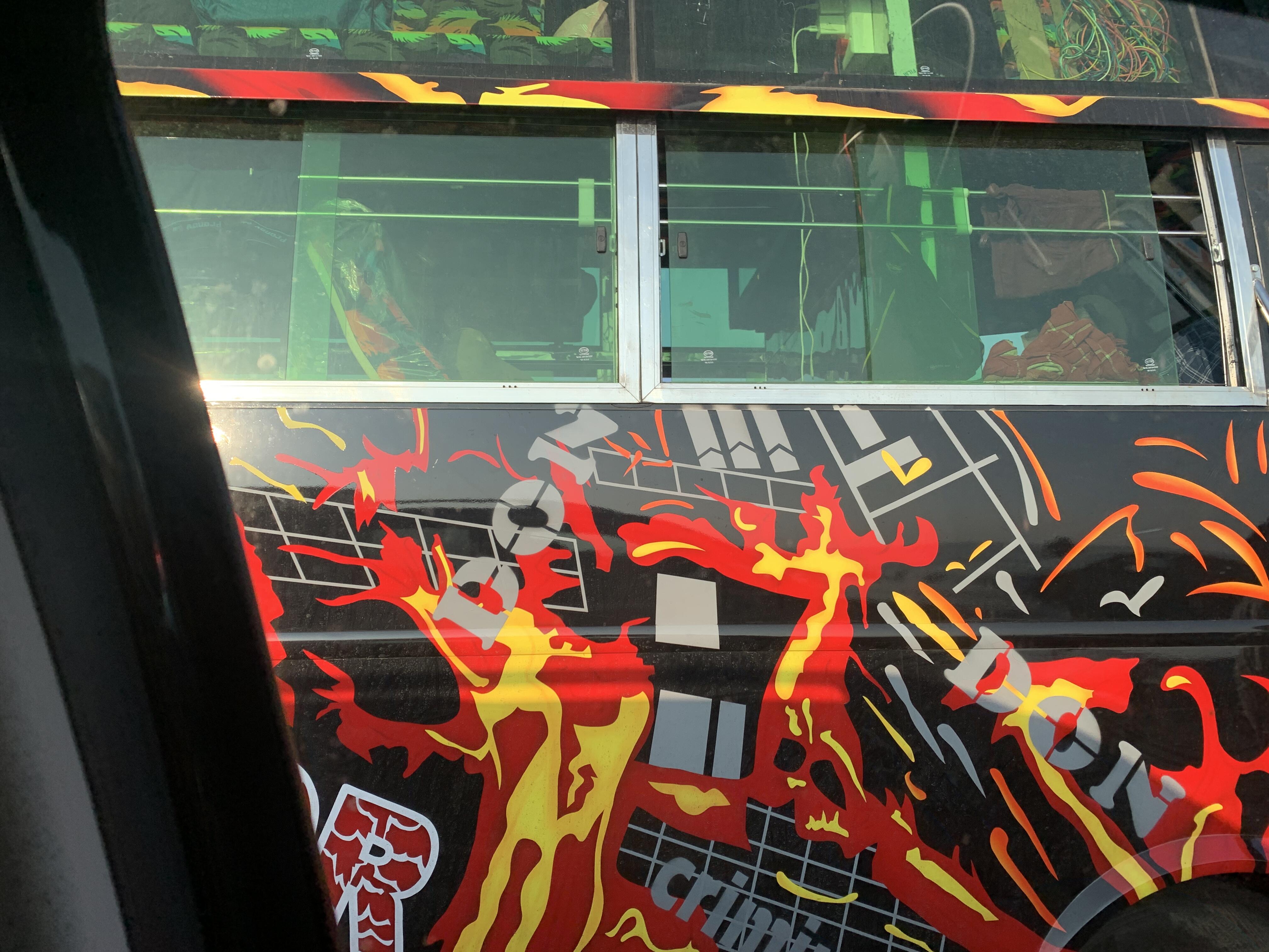 こちらはサファリをイメージしたものでしょうか。独特の緑をベースにしたジャングル感がよくでています。サイドミラーについている飾りは魔除けです。長距離バスやトラックには、事故がおこらないように魔除けを施しています。