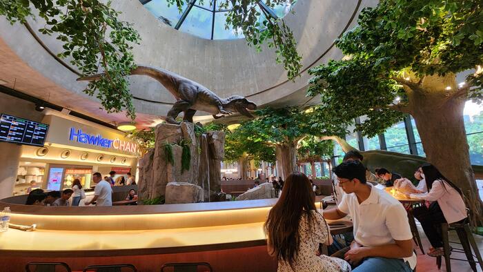 スーパーツリーのすぐ目の前なので、夕食の途中で光のショーが始まってしまってもすぐに駆け付けることができます。外のカフェにも、中のフードコートにも恐竜がいて、30分ごとに恐竜が動いて声を上げます。まるでジェラシックパークみたいです。