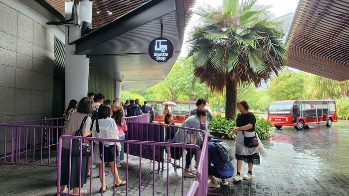 この駅はマリナ・ベイ・サンズのモールとホテルに直結しています。園内シャトルが利用しやすいのはこちらの駅です。地下鉄出口近くのアトラクション、フローラル・ファンタジーの前からシャトルは出ます。往復3ドル。