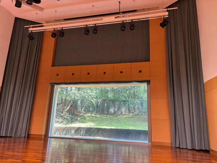 そして、少しおまけのようではありますが、私たちが研修会議で使用したホールのステージからの風景です。とても綺麗で清潔な場所で、会議がはかどりました。窓から見える景色ではここが個人的に1番好きだったので、ワーケーションなどお仕事も快適に出来ますよ!ということでご紹介させて頂きます。