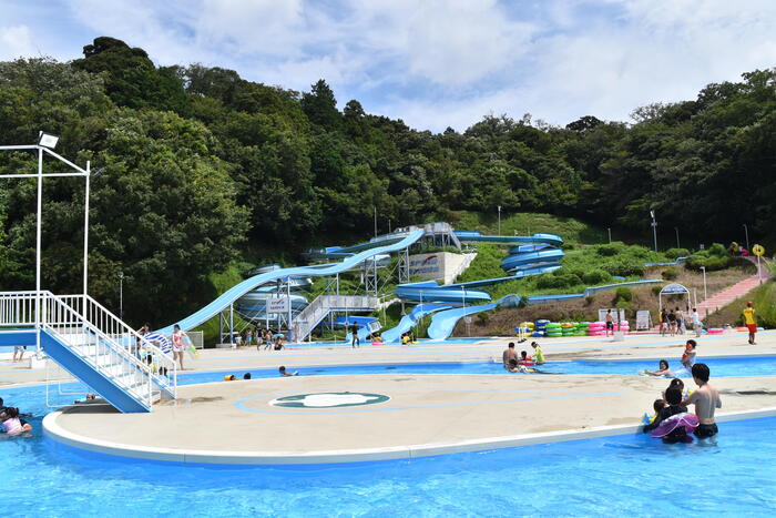 私が訪れた日は、かなり暑かったですが、まだ4月でしたので、水の入ってないプールエリアを特別に見学させて頂いたのですが、それでも滑り台の大きさとプールの広さ山の緑とのコントラストの美しさに感嘆しました。