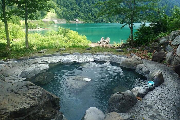 さらに、目の前にはエメラルドグリーンの白水湖が広がり、周囲の新緑や雄大な景色を眺めながらの入浴は格別。湯温は約40度と適温で、長湯にもぴったり。