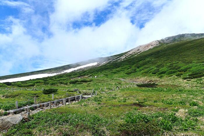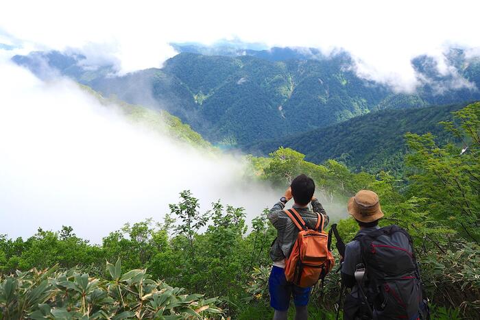 さらに高度を上げるにつれ、濃霧が波のように峰々を覆い隠したり、残雪が残る雪渓が姿を現したりと、高山ならではの変化に富んだ景観が楽しめます。