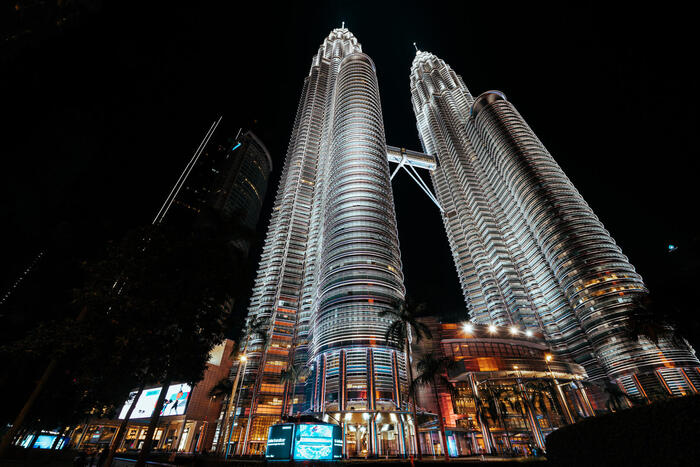 <TOP画像:ライトアップされたクアラルンプールにあるペトロナスツインタワー>