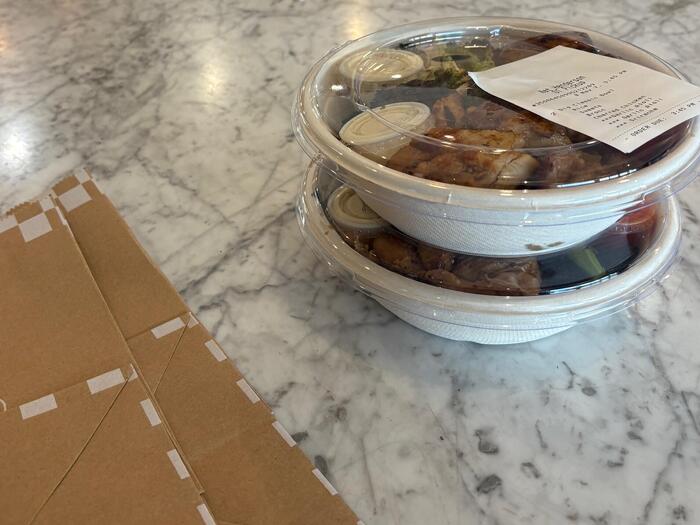 料理はイートインでもテイクアウトでも、だいたい紙で出来た環境に優しい簡易な容器に入っています。但し、蓋は中身が見える透明なプラスチック製を使っている場合が多いです。