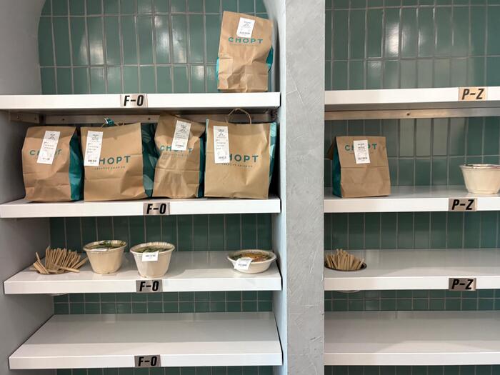 容器を紙袋に入れてくれるお店もありますが、ほとんどの店では袋やバッグには入れられておらず、蓋つきの容器に名前が書かれたレシートを張り付けて棚や台の上に置かれていて、自分で名前を確認して持っていきます。