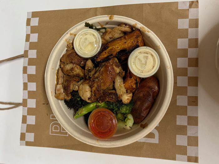 ローストしたチキンとブロッコリー、スイートポテト、ワイルドライスを組み合わせたクラシックDIGは、看板商品。スイートポテトはとても柔らかくて、まるでかぼちゃを食べているような感じです。バルサミコ酢やペストなど、数種類のソースの中から選べますが、私はいつもスリラチャとガーリックアイオリを注文します。