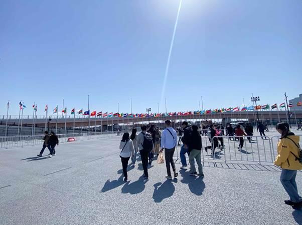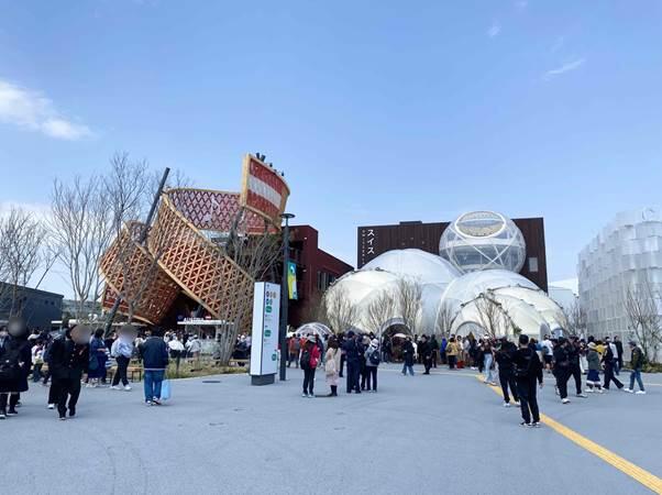 建物に近づくと、事前に写真で見ていた以上に現地の街並みをリアルに再現したパビリオンの雰囲気に圧倒されました。外国人の来場者も多く、本当に海外に来たかのような気分を味わえます。