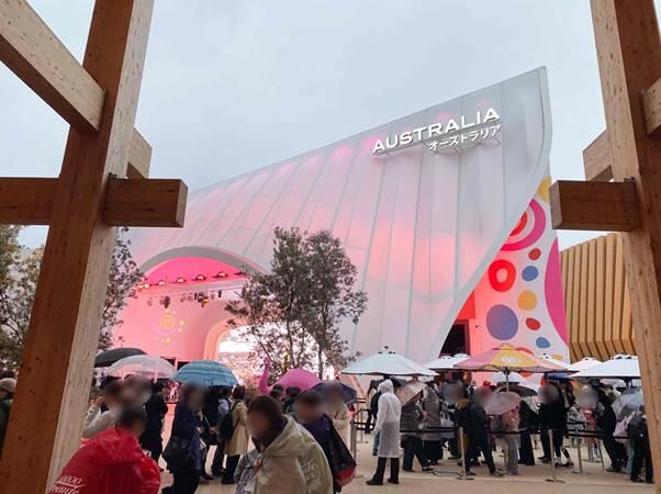 事前予約で訪れたのはオーストラリアパビリオン。20分ほど並び、無事入場できました。このとき結構な雨が降っていたのですが、屋外の行列には大きなパラソルが設置されていて、雨に濡れずに済む場所がいくつかありました。