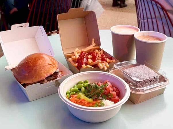 2人分のランチとして「ブリスケットバーガー」「サーモンボウルポキ」「フライドポテト(チキンソルト付き)」、そしてオーストラリアで親しまれているコーヒー「フラットホワイト」、たっぷりのココナッツをまとったケーキ「ラミントン」を注文。どれも食欲をそそる日本人でも十分楽しめる味付けでした!(※商品・値段は変動する可能性があります)