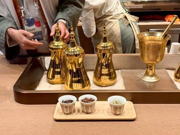 サウジコーヒーは、注文するとすぐに金色のポットから注がれ、提供されます。小さなカップに入った熱々のコーヒーは、カルダモンの香りがふわりと広がるエキゾチックな味わい。セットで提供されたドライビーツは、コーヒーと一緒にいただくと、体にじんわり染み渡るような美味しさで、心まで温まる組み合わせでした。