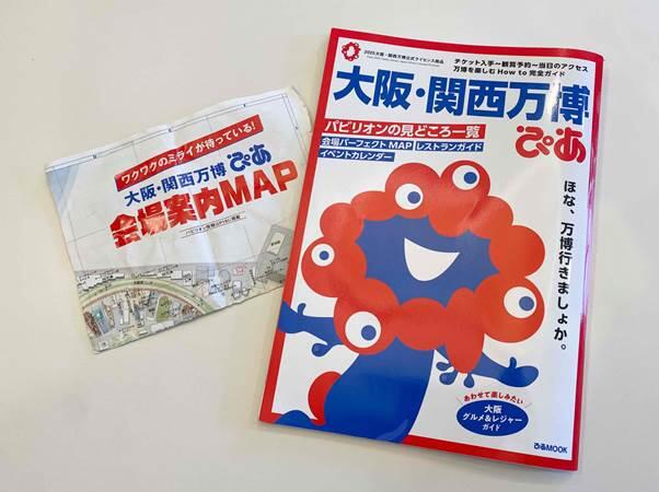 <2025大阪・関西万博公式ライセンス商品「大阪・関西万博ぴあ (単行本)」と付属する会場案内マップ>