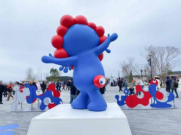 東ゲートをくぐってすぐの場所で来場者を出迎えてくれるのが、三つ指をついた丁寧な姿勢の公式PRキャラクター、ミャクミャクです。