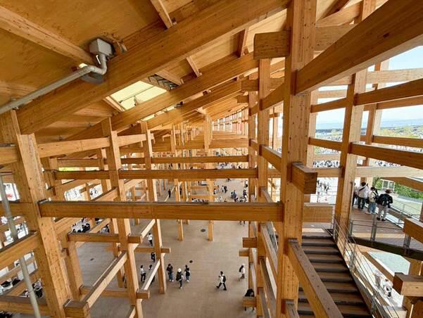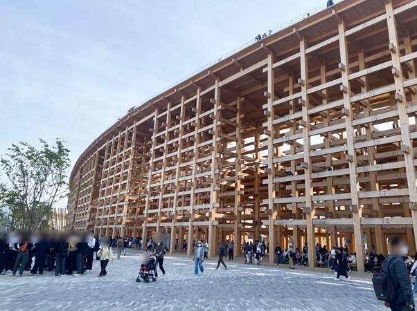 大阪・関西万博の会場内をぐるりと囲む巨大な木造リング「大屋根リング」は、直径約615メートルの規模を誇り、一周すると約2キロメートル、40分ほどの時間がかかります。万博を象徴する壮大なデザインが特徴です。美しくどこまでも続くように感じられるダイナミックさに、言葉を失うほどでした。