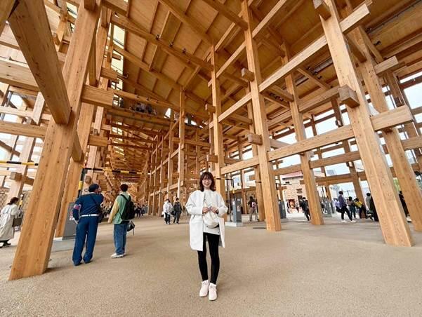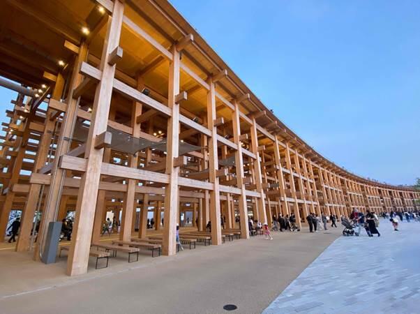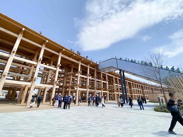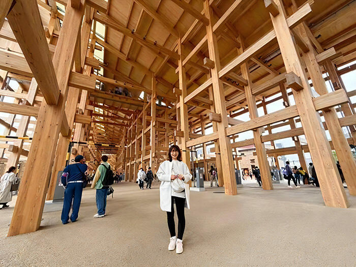 大きな天井が開放的な空間を作り出す大屋根リングの下もぜひじっくり歩いてみてほしいです。自動販売機やゴミ箱、ベンチなどが設置されていて、休憩や会場内の通り道として移動時に利用する人が多かったです。また、絶好のフォトスポットでもあるので、お気に入りの場所を見つけて、思い思いの写真を撮影するのもいいですよ。