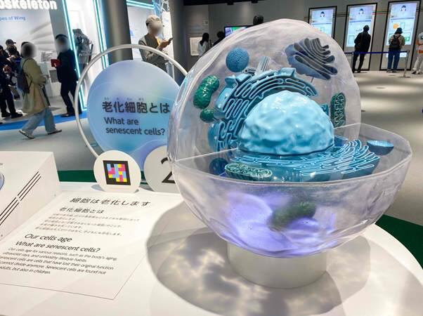 江崎グリコ株式会社の「細胞研究所」では、「細胞ケア」をテーマに、細胞の老化にアプローチする方法を探っています。生きるうえで欠かせない"食"による細胞ケアは、老化を遅らせるヘルスケアとして研究が進められているのだとか。細胞の模型やタッチパネル式の画面を使って、楽しみながら理解を深めることができます。