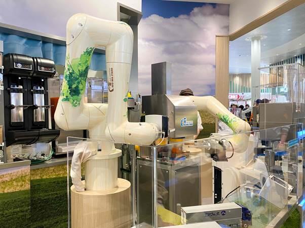 展示ブースの最後には、食のブース「ミライの食と文化」があり、さまざまなグルメを購入できます。印象的だったのは、ロボットが作る大阪名物のミックスジュース。ミャクミャクが描かれた可愛らしいカップで提供されます。